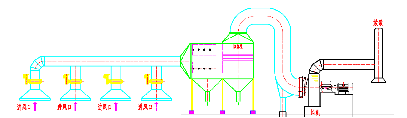 高效水浴精除塵器主要由進風管、室體、頂噴管、排氣管、擋水板、下噴管、過濾器、塑料球、托球網(wǎng)、泄水斗、水旋器、送水管路、水泵、排污管、沉淀池和清水池等部件構成。其中,進風管是一個橫放的矩形漸擴管,室體中間有隔板,水旋器由調(diào)節(jié)環(huán)、動力管和沖擊板組成,過濾器則由框架和濾布構成。